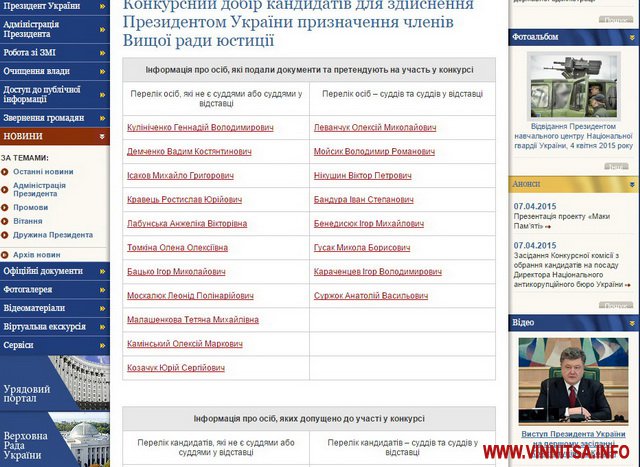 Триває процедура конкурсного добору кандидатів для здійснення Президентом України призначення членів Вищої ради юстиції. Документи для участі в конкурсі подали 19 осіб. З них 11 осіб, які не є суддями, та 8 осіб – судді та судді у відставці, серед них двоє вінничани – Анатолій Суржок, Віктор Нікушин.