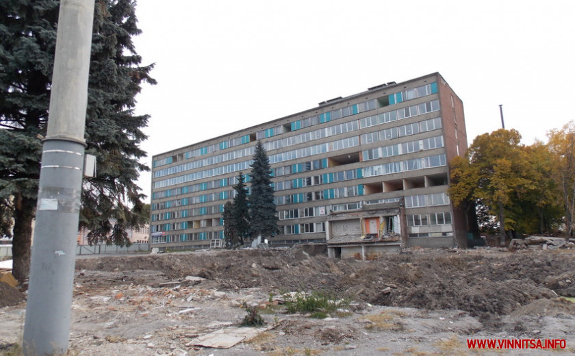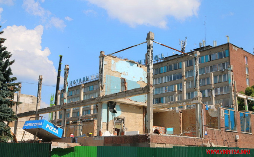 У Вінниці триває демонтаж колишнього готельного комплексу «Південний Буг», який розпочали у травні цьогоріч. Якщо станом на липень там лише розібрали двоповерхове приміщення з дискоклубом та кафе, то зараз, від них не залишилось й сліду. Все зрівняли із землею. Як і асфальтовану парковку навпроти. Територію будівництва огородили зеленим металевим парканом. У центрі коричневий бокс зі скляними вікнами та дверима. У таких самих, під час зведення інших житлових комплексів, зазвичай працюють представники фірм забудовників. Але у цьому поки, лише залишки матеріалів, старе офісне крісло та тумба.