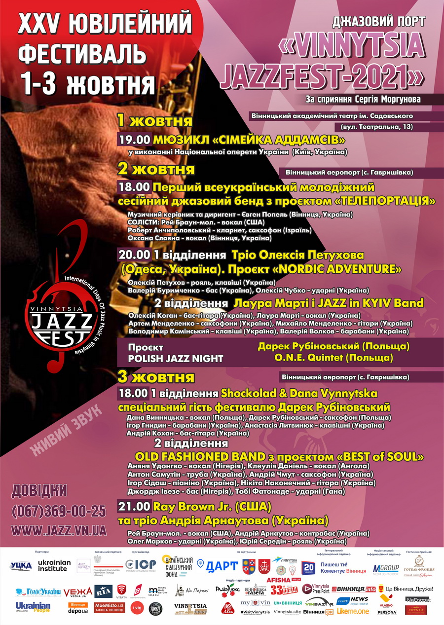 А з 1 по 3 жовтня приходьте за новими незабутніми емоціями на яскраві події ювілейного XXV міжнародного джазового фестивалю VINNYTSIA JAZZFEST-2021, який цьогоріч проходить за підтримки Українського культурного фонду, Державного агентства розвитку туризму, Генерального консульства республіки Польща у Вінниці, Вінницької міської ради і ОДА та за особистого сприяння Сергія Моргунова.