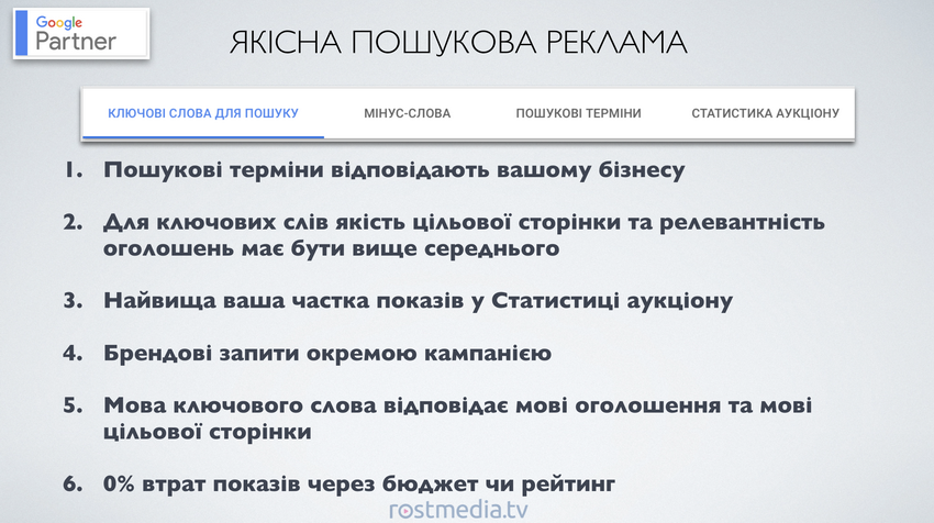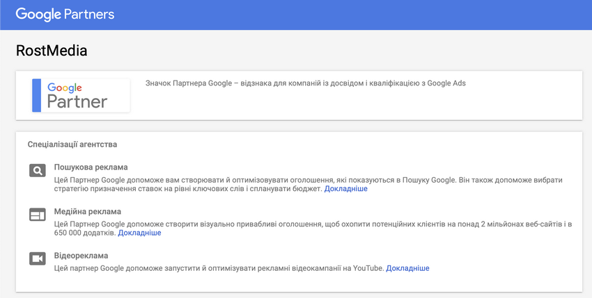 Ефективну та якісну пошукову рекламу можуть розміщувати компанії з активним статусом Партнера Google, зокрема РостМедіа. До речі, ми оновили наш сайт.