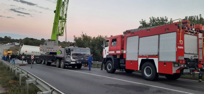 Зіткнулись дві вантажівки Volvo, одна з яких перевозила пальне. Від удару одна з автівок з’їхала з проїзної частини дороги та перекинулась. Внаслідок чого відбулось пошкодження цистерни та витік пального.
