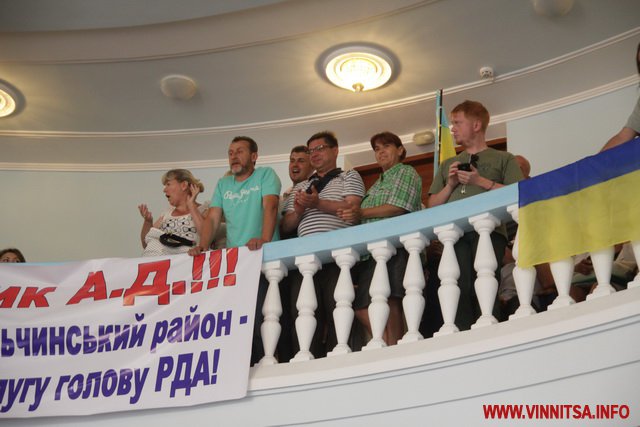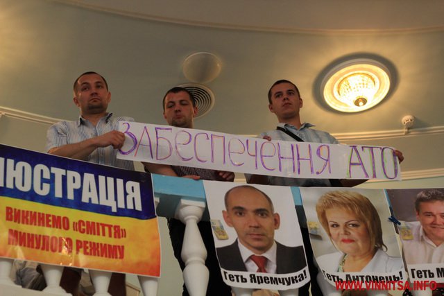 Під час сесії були присутні ініціативні групи від громадських організацій, які розгорнули плакат із написами «Люстрація. Виметемо сміття минулого режиму», «Аксельрод, Антонець, Вікалюк, Форманюк, Яремчук, Мельник – Геть з облради!», а також розвісили фото колишніх «регіоналів», яких необхідно виключити з облради.