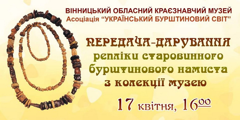 Урочиста церемонія дарування музею репліки-реконструкції давнього бурштинового намиста з Гордіївського могильника відбудеться 17 квітня о 16.00 годині в приміщенні Вінницького обласного краєзнавчого музею, що по вул. Соборна, 19.