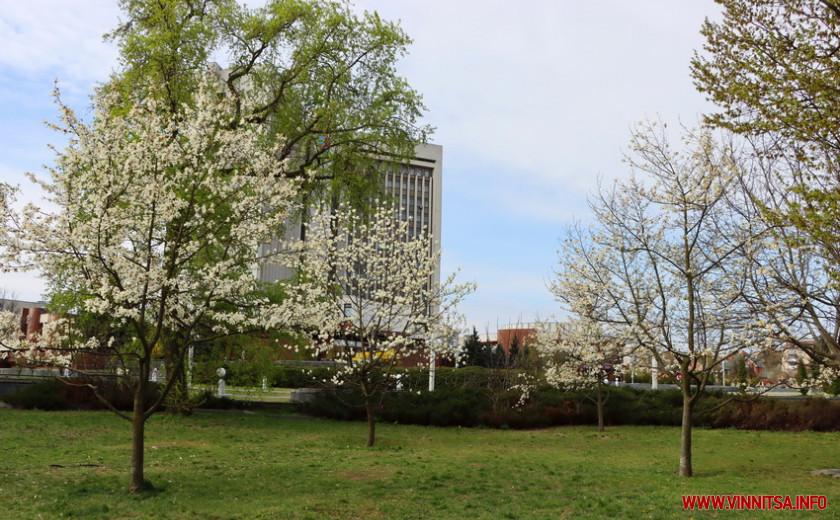 Цьогоріч розпустилися одразу ж всі дерева – їх перед площею ім. Стуса близько десяти. Одні мають великі пишні квіти, інші дрібненькі. Сильний вітер, який був кілька днів поспіль, «обтрусив» пелюстки на траву.