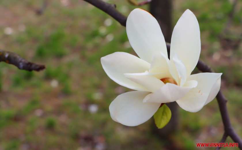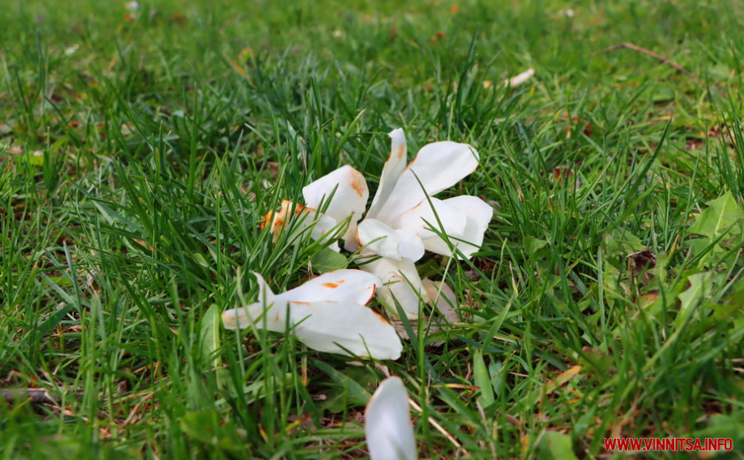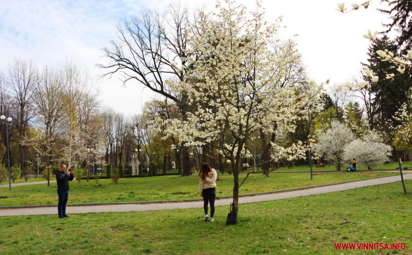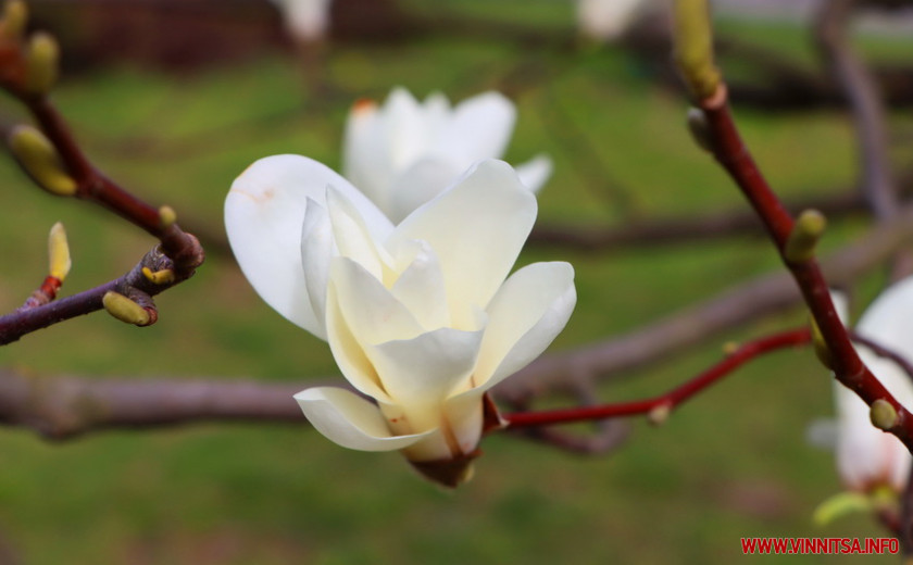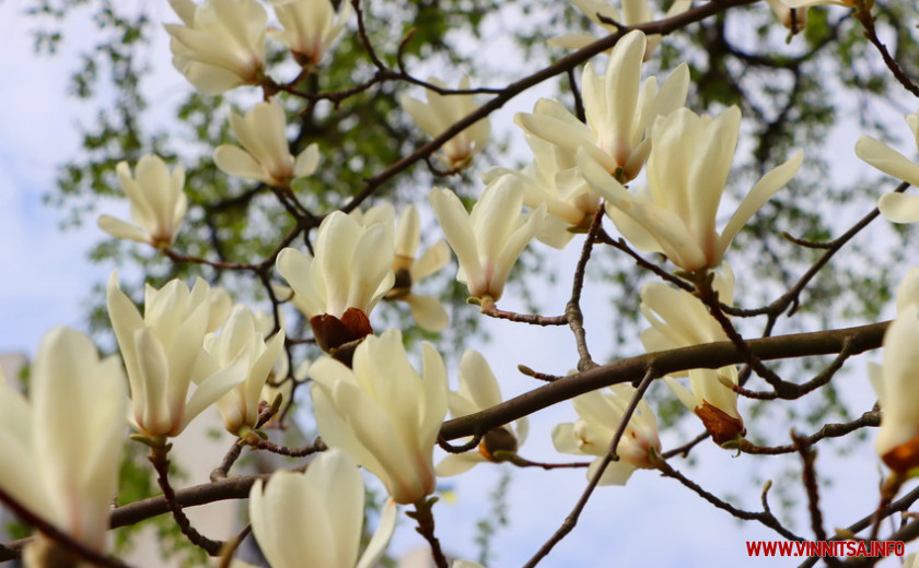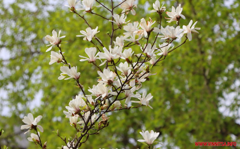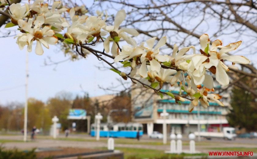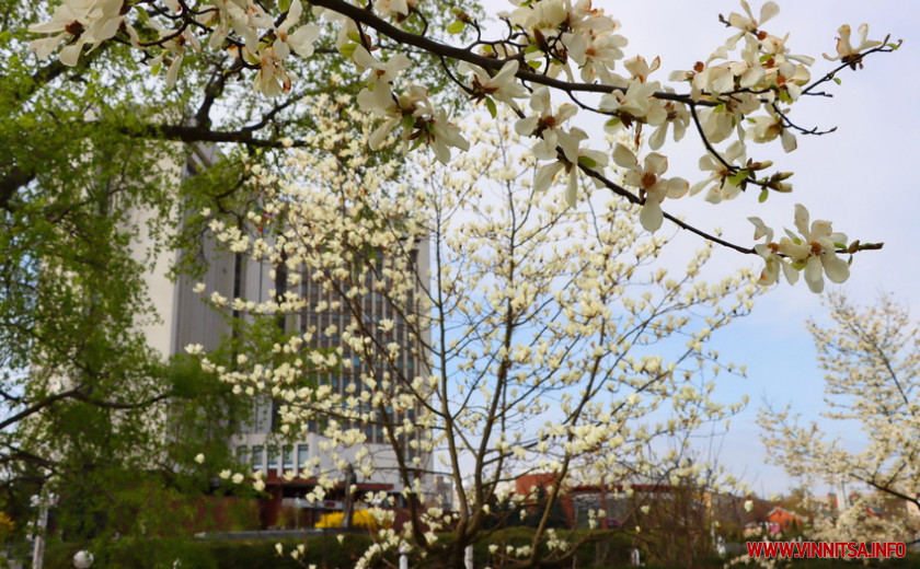 В середині весни у Вінниці біля «Книжки» розцвіли магнолії. Дерева рясно вкриті білими квітами. Під сонячним промінням їх аромат розноситься на кілька десятків метрів.