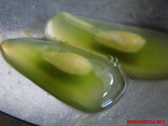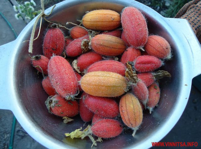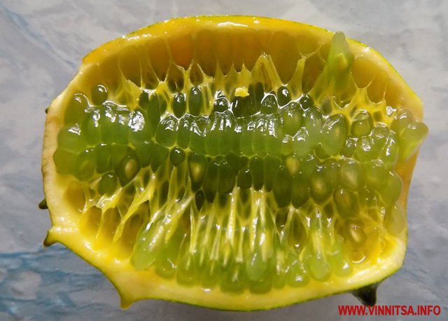 «Колючі - ківано. Ще їх називають рогаті або рогата диня, африканський огірок. Ще їх називають мелано і плутають з ангурією, тобто антильським огірком. Ківано - дуже близький родич звичайного огірка, як і диня. Він має трохи дрібніше листя, трохи вибагливіший до тепла, тому дехто його висіває спочатку на розсаду в стаканчиках, потім висаджує. У мене цього року вродили, висіяні в ґрунт, безрозсадним способом. Садив їх просто на городі. Дещо можна з розсади, тобто сіється в хаті на вікні, потім висаджується. Як гібіскус, наприклад», - розповідає Вінниця.info Юрій Сегеда, він журналіст, письменник, який має хобі вирощувати екзотичні плоди.