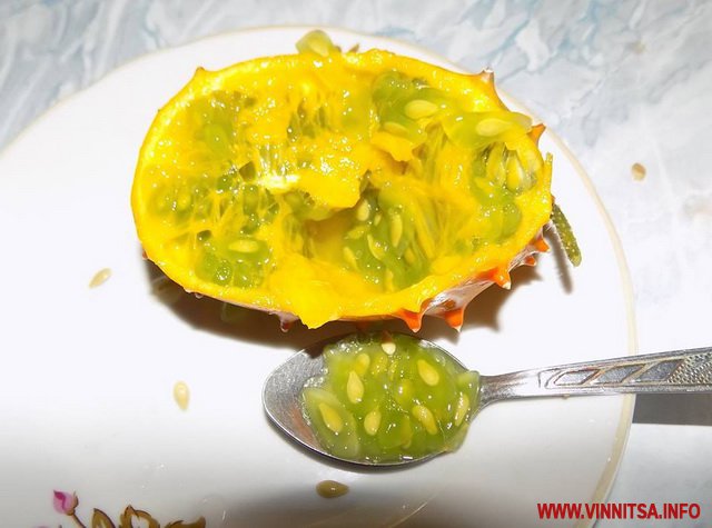 «Тобто якби ці екзоти були аж дуже цінними - смачними і урожайними, то їх би вирощувала більшість людей. У ківано їдять тільки м'якоть, тобто слиз разом із насінням, зі зрілих плодів. "Лушпайка" плоду твердувата і несмачна. Кажуть, у південних краях їх використовують для соків, для салатів. Насінинки в нього менші за огіркові, кожна покрита кисло-солодким зеленкуватим слизом. Мені на смак ніби непогане, мамі не сподобалось. Чув, ці плоди корисні для серця, для шлунка, вітамінне», - пояснює.