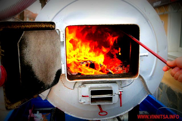 «Це котел-теплогенератор, який працює на дровах і всьому паливі рослинного походження: тирса, солома, дрова, пилети, брикети. Є дві камери згоряння: в першій горить деревина і виділяються гази, які догорають у другій камері згорання. За рахунок цього маємо повну роботу на одній загрузці до 10 годин.