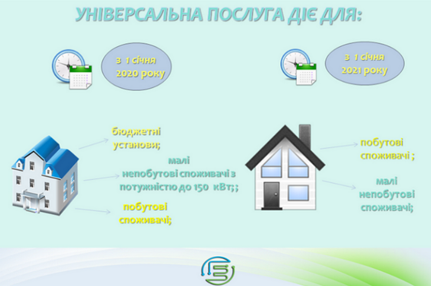 З 1 січня 2019 року до 31 грудня 2020-го, крім побутових та малих непобутових споживачів, універсальні послуги надаються також бюджетним установам, незалежно від розміру договірної потужності та іншим споживачам, електроустановки яких приєднані до електричних мереж з договірною потужністю до 150 кВт.
