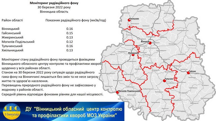 Стабільним та безпечним залишається радіаційний фон. Його показники на Вінниччині відповідають фоновим рівням для нашої місцевості, а перевищень природного радіаційного фону НЕ зафіксовано.