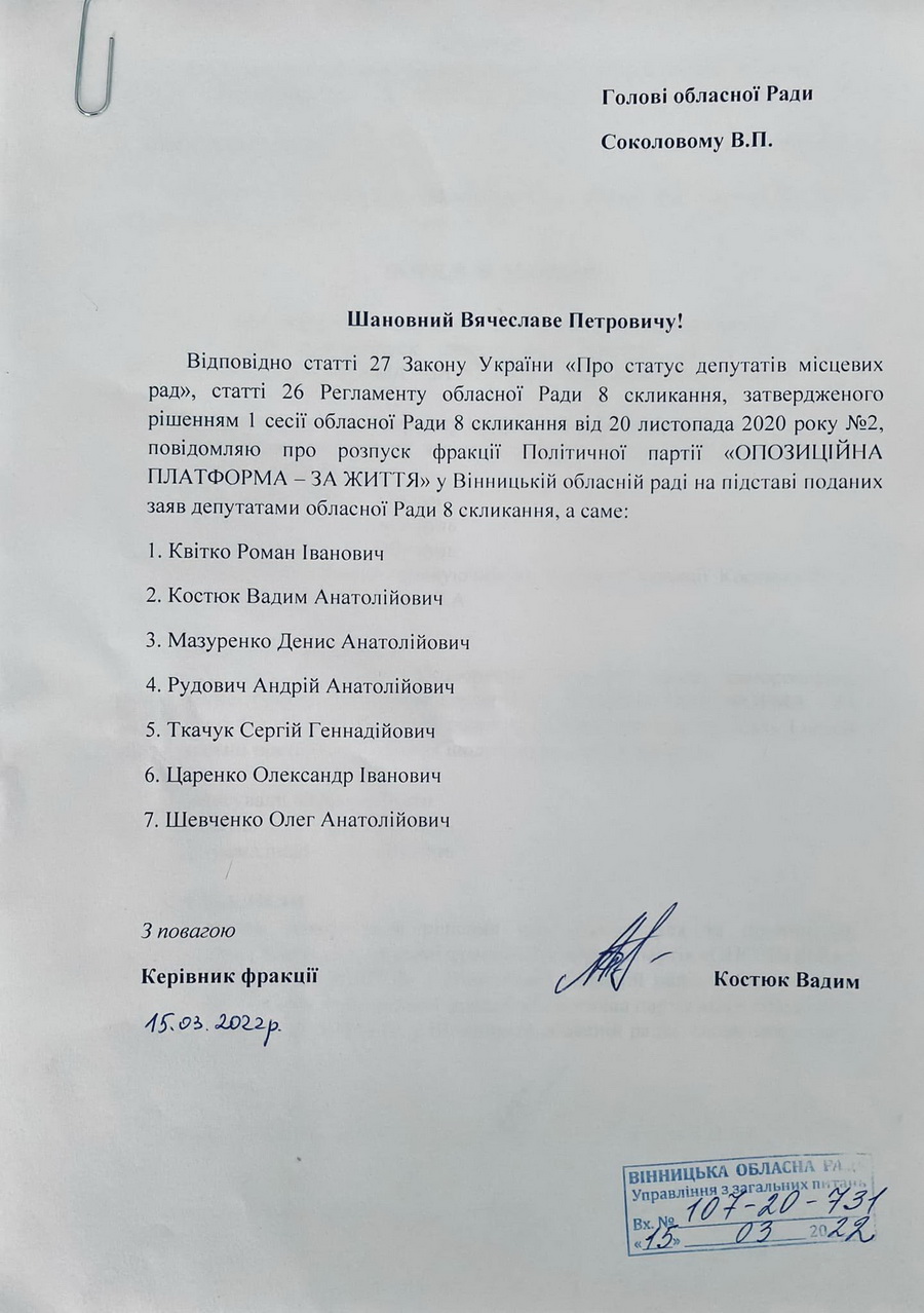 Фракція політичної партії «Опозиційна платформа – За життя» у Вінницькій обласній раді саморозпустилася.