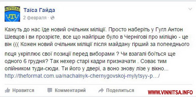 Через тиждень після представлення, 11 лютого, Шевцов зустрічався з журналістами, тоді у Вінниці ще ніхто не знав, що він сепаратист і відповідних питань йому не задавали. З середини лютого, антипатія активістки до керівника поліції почала зростати, Таїса Гайда періодично виставляла в мережі фото Шевцова: спершу з Валуєвим, потім фото дітей на параді, потім опублікувала скрін-шоти зі сторінки дружини Антона Шевцова, яка ставила «лайки» під постами з російської пропагандою. Вже 25 лютого Шевцов все спростовував перед журналістами і заявив, що інформаційна атака на нього і його родину здійснюється активісткою, через те що розслідування під його контролем показали причетність Таїси Гайди до незаконної видачі зброї та її чоловіка до подій 6 грудня із захопленням ОДА. «Масла у вогонь підлили» призначенням в заступники начальника поліції Олександра Селіверстова, який колись очолював Стаханівський відділ міліції. Його теж звинуватили в сепаратизмі. Епопеєю протистояння між активістами і керівниками Нацполіції області став пікет приміщення Нацполіції 10 березня з палінням шин і з перекриттям руху, коли допомагати вінницьким приїхав актив з інших областей.