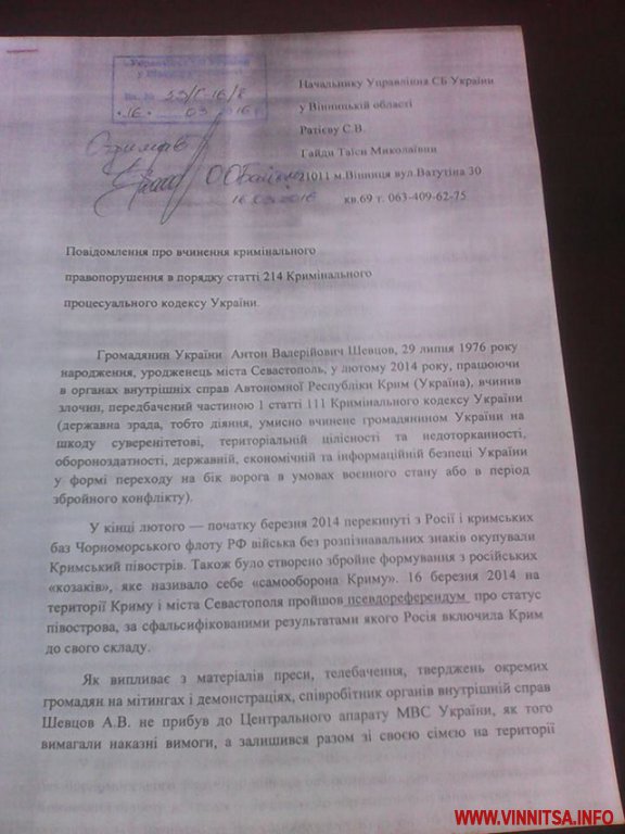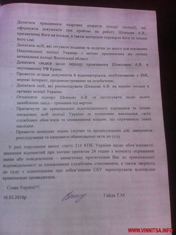 16 березня вінницька активістка Таїса Гайда направила на ім’я начальника УСБУ у Вінницькій області Сергія Ратієва повідомлення про вчинення екс-керівником ГУ Нацполіції Вінниччини кримінального правопорушення.