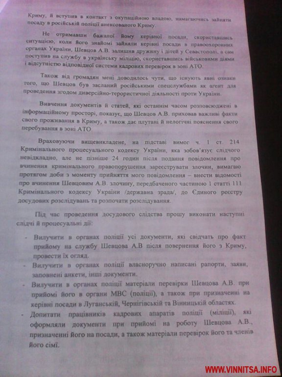 Не отримавши бажаної посади, скориставшись ситуацією, коли його знайомі зайняли керівні посади в правоохоронних органах України, Шевцов А. В. залишив дружину і дітей в м. Севастополі, а сам поступив на службу в українську міліцію, скориставшись військовими діями і відсутністю відповідної системи кадрових перестановок в зоні АТО...», - зазначено в повідомленні.