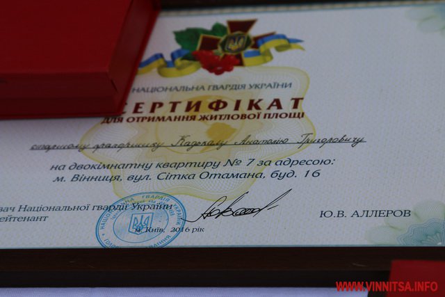 12 січня у Вінниці в частині 3008 Командувач Національної гвардії України Юрій Аллеров разом з головою облдержадміністрації та мером міста урочисто вручили ключі від квартир 9 родинам військовослужбовців Нацгвардії.