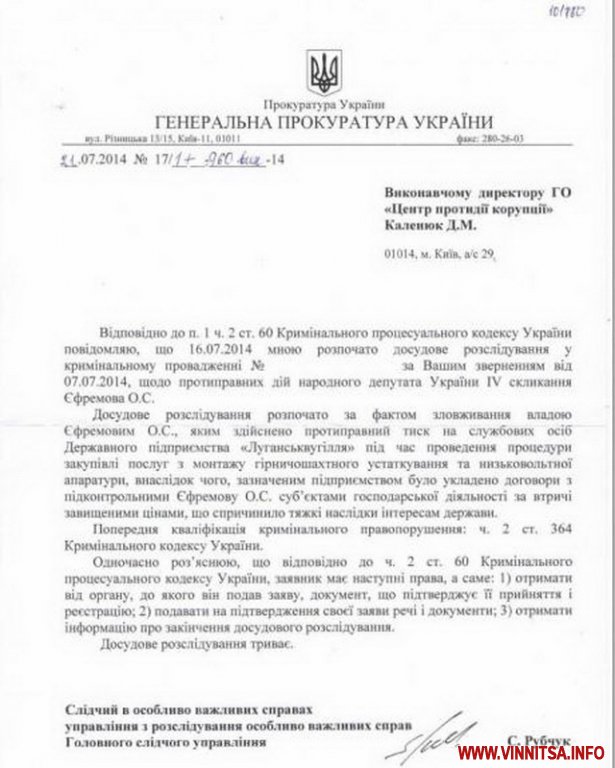 Об этом говорится в письме следователя ГПУ общественной организации «Центр противодействия коррупции».