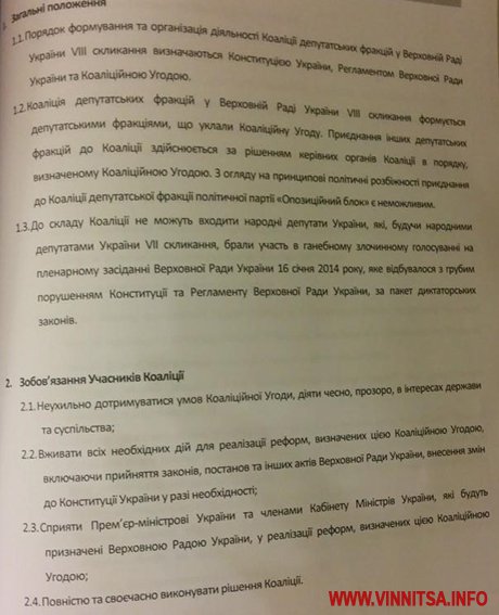 "До складу коаліції не можуть входити народні депутати, які…брали участь у ганебному злочинному голосуванні на пленарному засіданні ВР 16 січня 2014 року… за пакет диктаторських законів", - йдеться в документі.