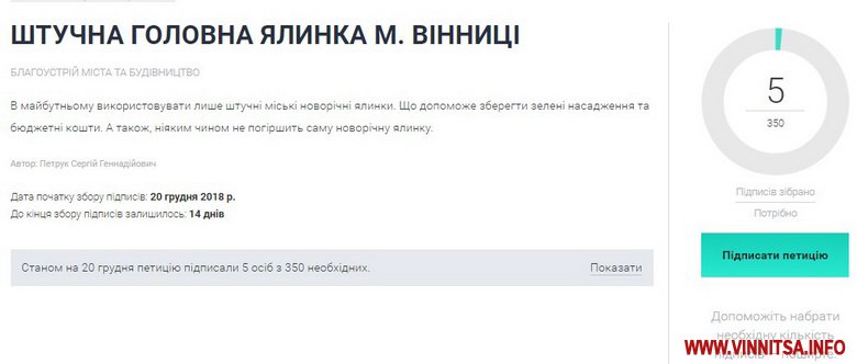 На сайті Вінницької міськради зареєстрували петицію, в якій просять у майбутньому замінити живу головну ялинку на штучну. Такі ж дерева використовувати для прикрашення всього міста.