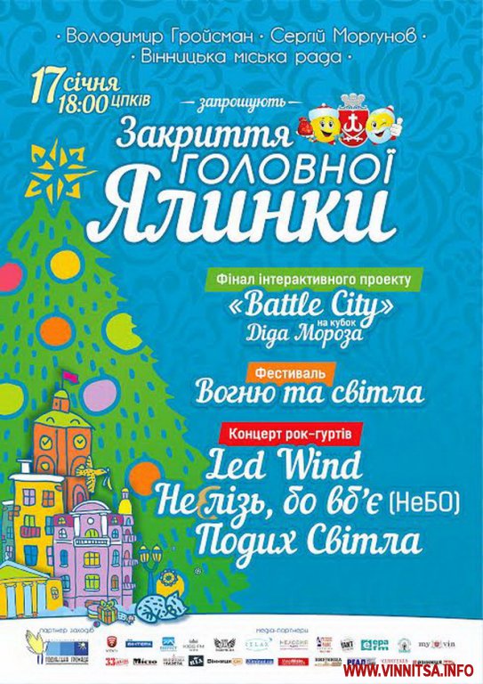 Вінничан очікує яскраве шоу вогню і світла та концерт від рок-гуртів. На сцені виступлять: Led Wind, Не лізь, бо вб’є, Подих світла. Цього вечора визначать переможців інтерактивного проекту «Battle City» на кубок Діда Мороза.