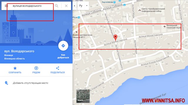 Google розпочав перейменування вулиць Вінниці, які змінили свої назви внаслідок декомунізації. Тепер на онлайн-карті міста замість вулиці Володарського – Монастирська, Фрунзе замінили на Академіка Янгеля, а Козицького на Миколи Оводова. Історичний центр міста тепер не на Першотравневій, а на Магістрацькій. Пошук показує нові найменування навіть за запитом старої назви.