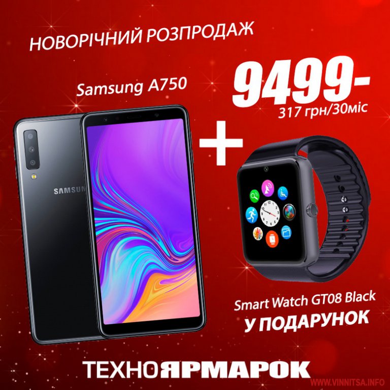 Смартфон Samsung A750 з потрійною камерою за 9499грн або у розстрочку 317 грн на 30 місяців + смарт-годинник Smart Watch GT08 Black в подарунок.