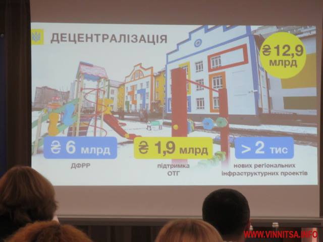 Презентуючи журналістам показники Державного бюджету на 2018 рік, Володимир Борисович підкреслив: «Децентралізація — це один із пріоритетів року, що наближається. Буде побудовано 2000 нових об’єктів у громадах: школи, дитсадочки, басейни, громадський простір. Що саме будувати — вирішуватимуть самі громади, оскільки саме на місці видніше, що потрібно будувати та розвивати. У бюджеті передбачено Державний фонд регіонального розвитку в обсязі 6 мільярдів гривень, субвенція на підтримку розвитку інфраструктури об’єднаних громад — 1,9 мільярда, субвенція на соціально-економічний розвиток регіонів — 5 мільярдів гривень».