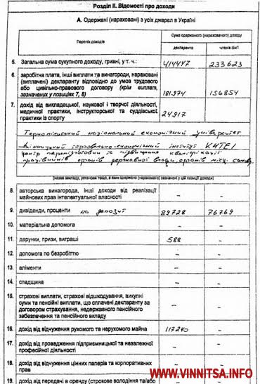Голова Вінницької ОДА за 2015 рік задекларував 414447 грн. доходу, з них зарплата – 181974 грн., дохід від викладацької діяльності в Тернопільському національному економічному університеті (Центр підготовки держслужбовців) - 24917 грн., проценти на депозит – 24917 грн., подарунки – 588 грн., дохід від відчуження рухомого і нерухомого майна – 117240 грн. Ще 233623 грн. доходу задекларувала дружина Валерія Вікторовича.