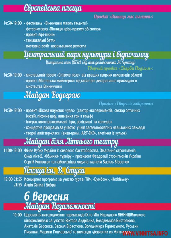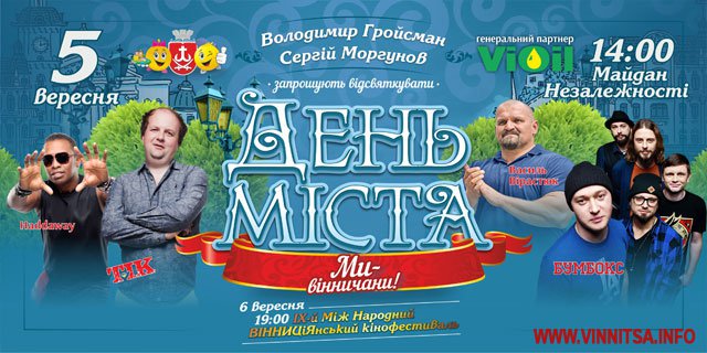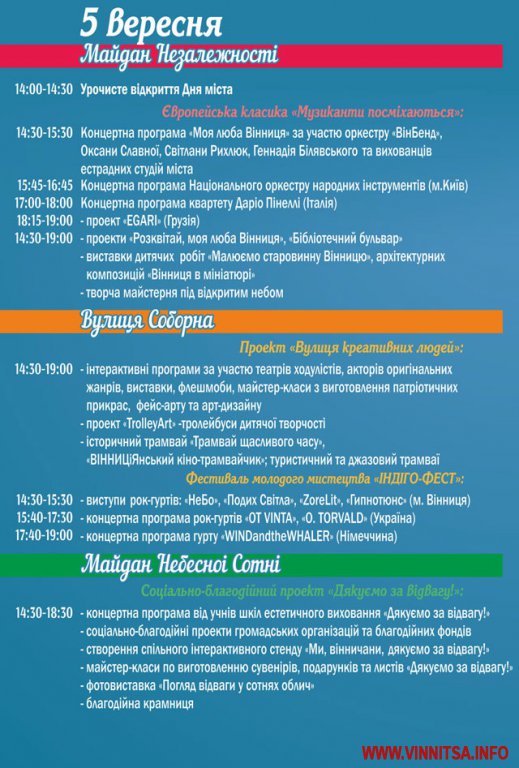 5 вересня на восьми різних майданчиках протягом дня проходитимуть концерти, майстер-класи, фотовиставки та благодійні акції. На завершення відбудеться святковий концерт за участі відомих світових зірок та українських виконавців. Для вінничан на площі Стуса виступатимуть Haddaway, Бумбокс і ТІК.