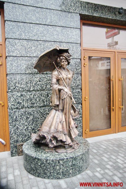 На Вулиці Соборній, біля готелю «Франція» скульптура панянки «Євгенії Прунмайер». Автор – Володимир Оврах.