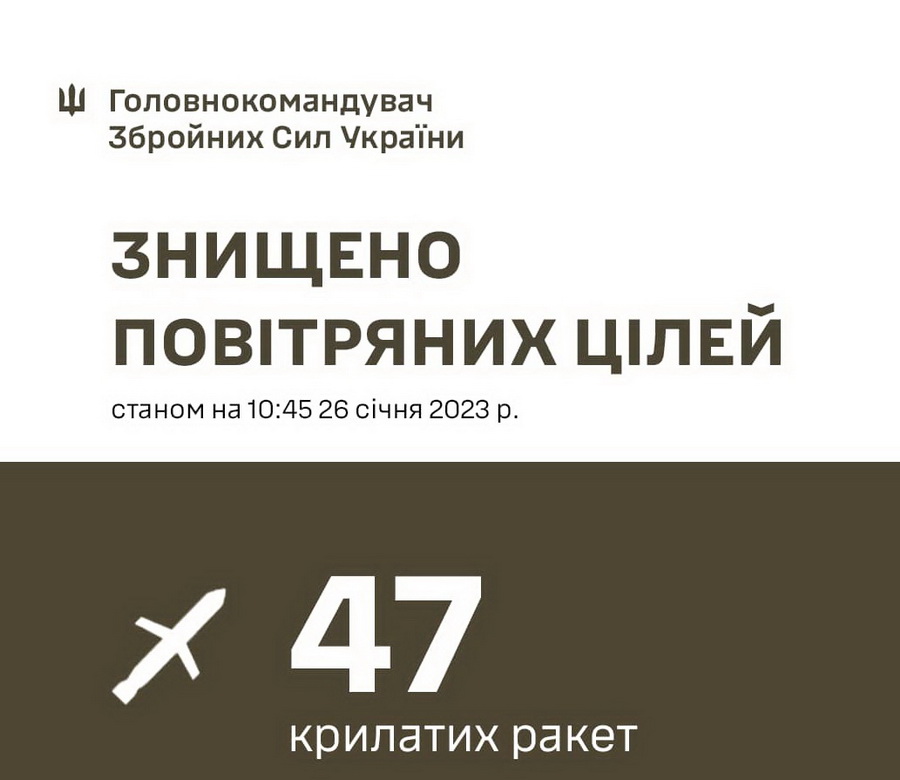 Силами та засобами Повітряних Сил ЗС України у взаємодії з підрозділами інших складових Сил оборони знищено 47 крилатих та керованих авіаційних ракет. Крім того, три із чотирьох керованих авіаційних ракет Х-59 не досягли своїх цілей.