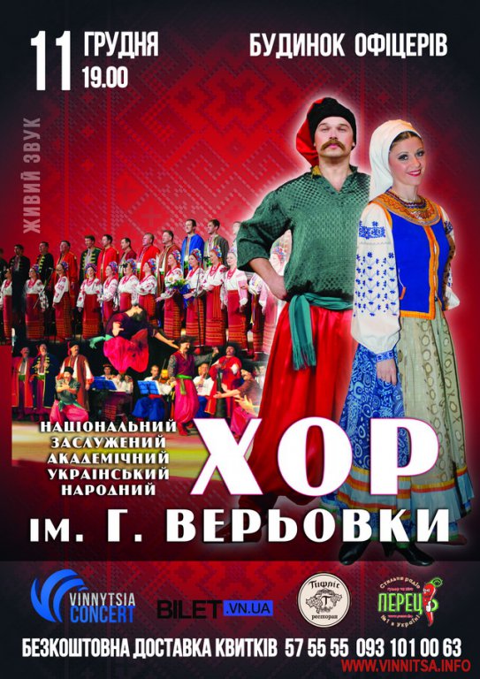 11 грудня о 19.00 у Будинку офіцерів славетний Національний заслужений академічний український народний хор України імені Григорія Верьовки з великим сольним концертом у Вінниці.
