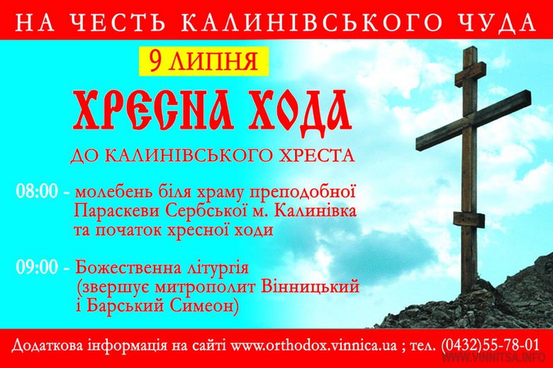 Хресна хода розпочнеться після молебню, який о 8.00 буде звершено біля храму прп. Параскеви Сербської м. Калинівки. Божественна літургія біля Калинівського Хреста, яку очолить митрополит Вінницький і Барський Симеон, запланована на 9.00.