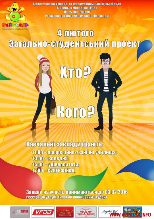 4 лютого у Вінниці відбудеться грандіозна «битва» між хлопцями і дівчатами. У проекті «Хто? Кого?» змагатимуть команди навчальних закладів. Кожен вуз може зареєструвати дві команди по 3 учасники – жіночу і чоловічу.
