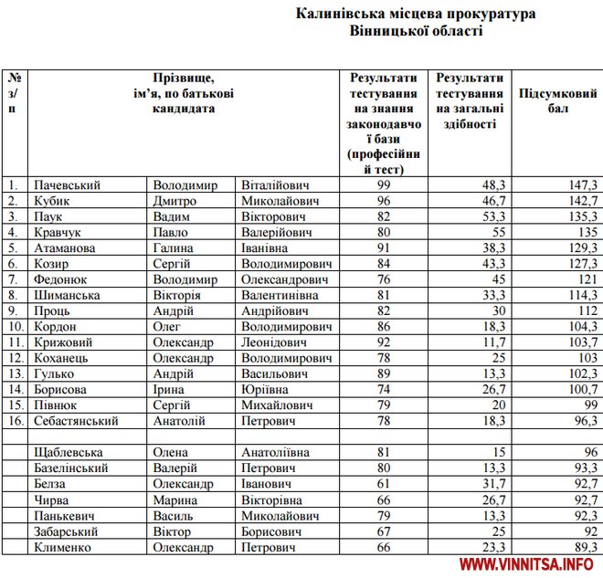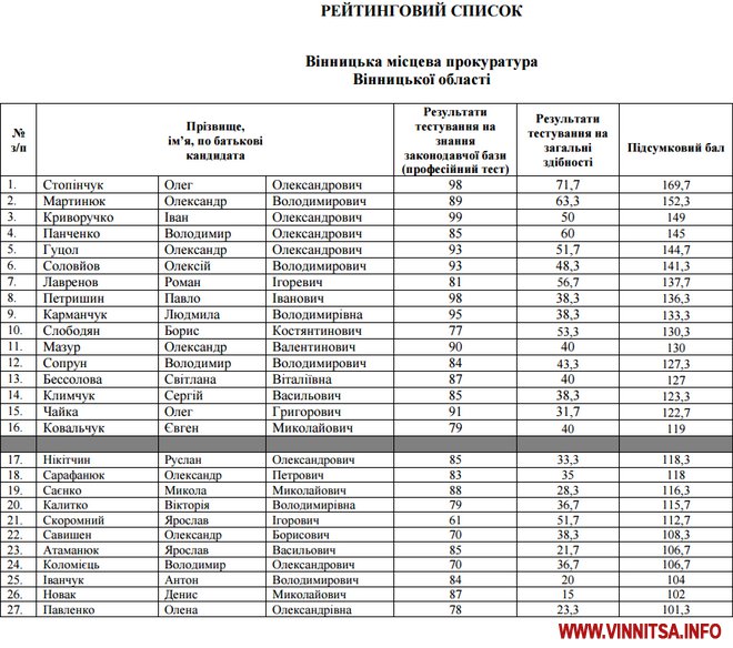 На сайті ГПУ опубліковані рейтингові списки кандидатів за результатами двох етапів конкурсу. На Вінниччині, зокрема, кадрова «чистка» торкнеться Бершадської, Жмеринської, Могилів-Подільської, Калинівської, Вінницької та Немирівської прокуратур.