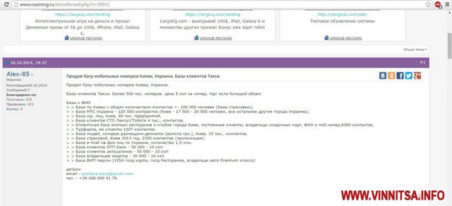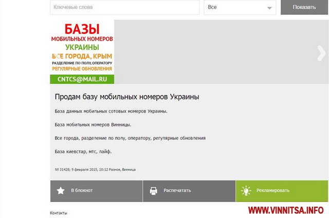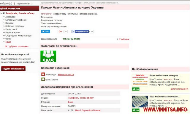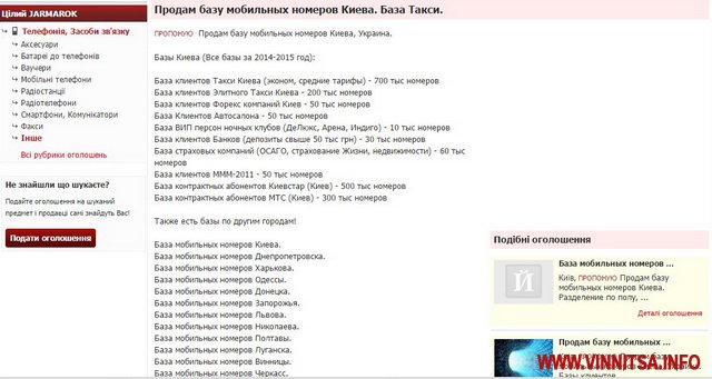 Тим часом Інтернет рясніє оголошеннями про продаж бази телефонних номерів. Пропонують контакти з вибором цільової аудиторії, або за місцем проживання. Найпопулярнішими і найбільш поширені пропозиції – по м. Києву.