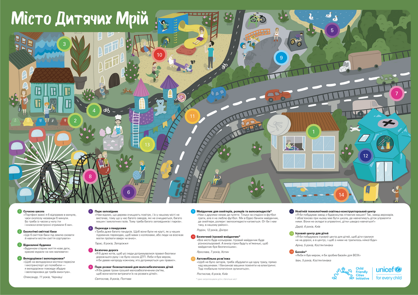 Як виглядало б місто, мер якого - дитина? ЮНІСЕФ провів конкурс, під час якого діти з усієї України у формі відео, малюнків або текстів розказували про те, яким би хотіли бачити своє місто і що змінили би у ньому, якби раптом очолили своє місто. Найоригінальніші та найцікавіші пропозиції, лягли в основу карти Міста Дитячих Мрій. Карта буде використовуватись для адвокації створення у громадах дружнього до дитини середовища.
