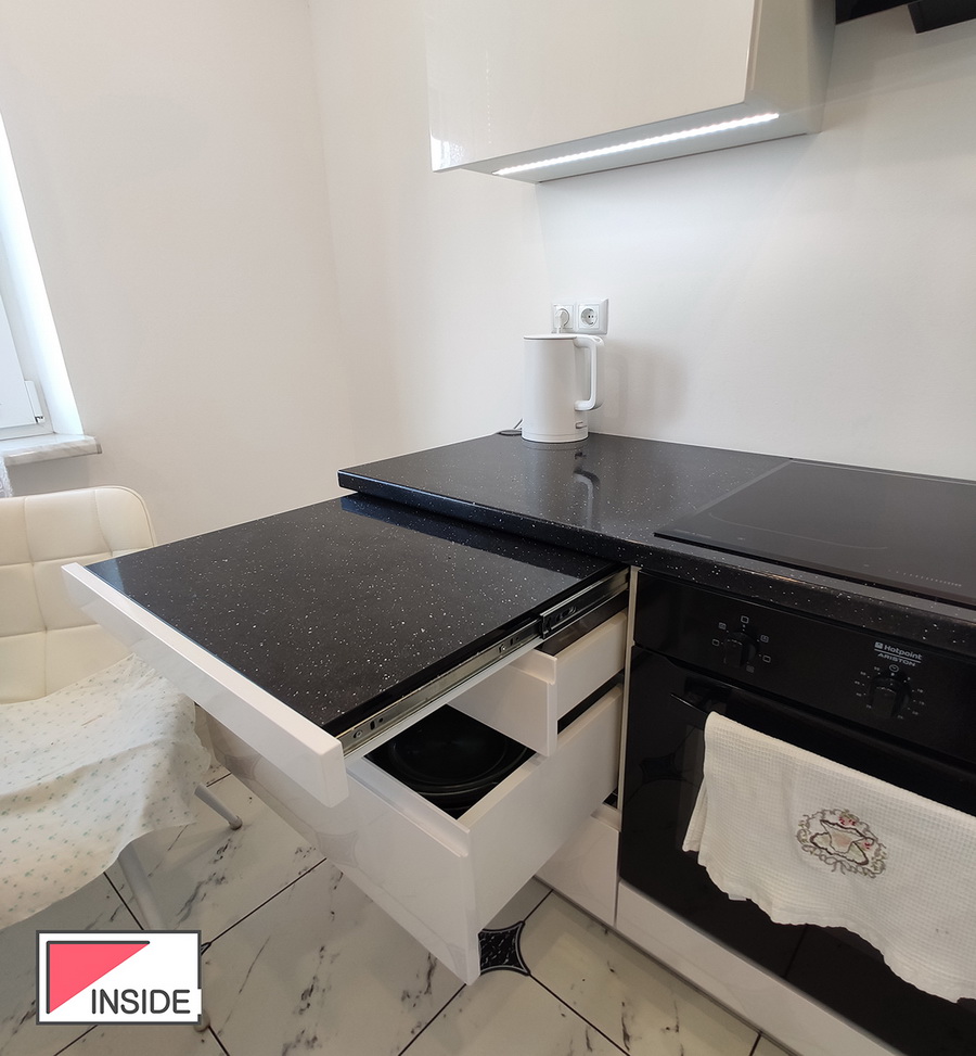 Мінімальна відстань від основної кухні 80 см, оптимальна 90 см – 1 м. Саме така відстань потрібна, щоб ви могли повністю висунути шухляду, присісти і дістати щось із нижньої полиці шафки.