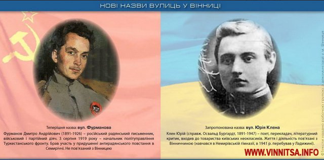 У Вінниці робоча група з питань декомунізації пропонує перейменувати вулицю радянського Фурманова на вул.. Юрія Клена, який був поетом, перекладачем та літературним критиком. Життя та діяльність Юрія Клена пов’язано з Вінниччиною, так як у 1941 році він навчався в Немирівській гімназії.