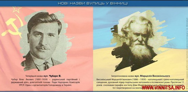 Також пропонують перейменувати вулицю В. Чубаря, який є одним з організаторів голодомору в Україні. Вулицю хочуть назвати Марцелія Високінського – греко-католицький священик, який 11 років очолював парафію костелу Діви Марії Ангельської, що на Соборній у Вінниці.