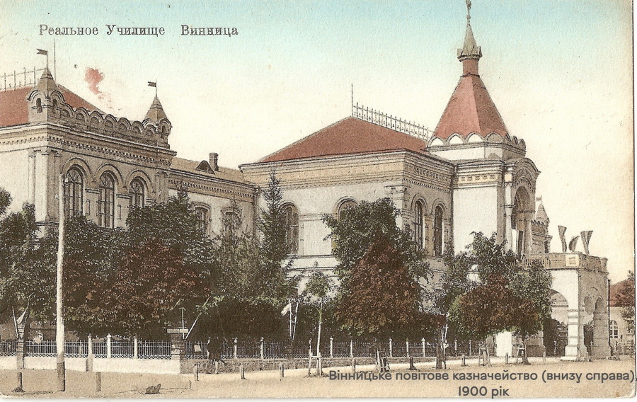 За історичними джерелами, будівлю - тоді ще одноповерхову -звели ще між 1896 та 1900 рр. одразу за реальним училищем. Розмістили у приміщенні повітове казначейство. До речі, як свідчить листування між міським головою та очільником губернської скарбниці тих часів,фінансисти місцем були не задоволені. Адже тоді це була окраїна Вінниці.