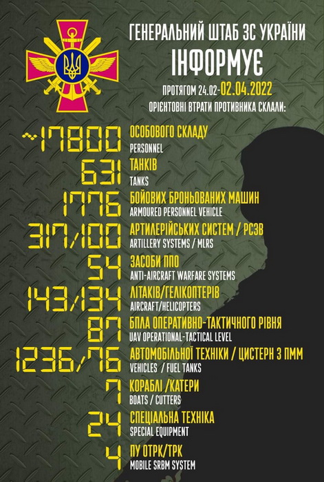 Cтаном на початок 2 квітня, у Генеральному штабі ЗСУ повідомляли про те, що від 24 лютого наші Захисники знищили 143 літаки та 134 гелікомпери ворога.