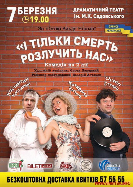 – Повна вибухового італійського гумору, яскравих костюмів, оригінальних декорацій та дивовижна своїми поворотами подій, комедія «І тільки смерть розлучить нас» прийдеться до душі всім глядачам! А блискучий акторський склад зоряного тріо: Остапа Ступки, Катерини Кістень і Костянтина Костишина - привнесе особливий шарм у постановку, роблячи вечір, проведений у стінах театру незабутнім! – обіцяють організатори гастролей – компанія «ВІННИЦЯКОНЦЕРТ».