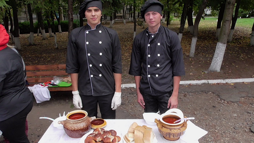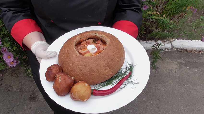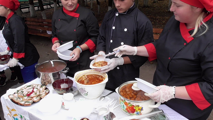 «От Дарина Олексієнко приготувала львівський борщ із сосисками. Звісно, він був зварений на м’ясному бульйоні. Але, туди були також додані копчені сосиски. Подала студентка свою страву оригінально – у хлібині. Ще одна третьокурсниця, Юлія Денисевич, приготувала борщ по старовинному родинному рецепту. Технологію приготування їй передав її батько, який просто полюбляє кулінарити, а його навчила бабуся. Одна з відмінностей їх рецептури – копчена курка. А ще особливий інгредієнт, який навіть по секрету не розкрили майстру з виробничого навчання», - посміхається Саламатова.
