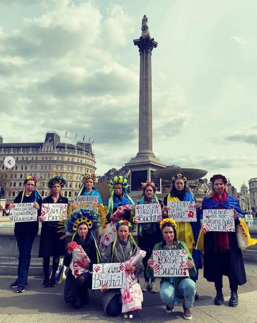 «Долучилася до акції в підтимку України у Лондоні. Хочеться подякувати всім хто приходить і підтимує нас за кордоном. Хочеться подякувати Ксенії Мілецькій за ідею і організацію перформансу в підтримку Бучі, Гостомель, Ірпінь, Ворзель, Волноваха, Харків, Маріуполь …. та інших міст, які зазнали руйнувань від рашистської орди.
