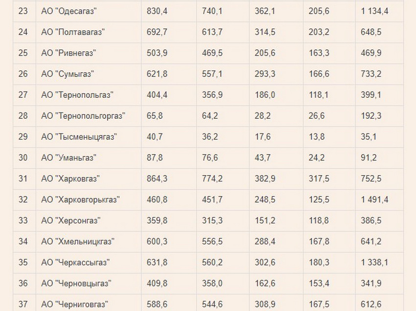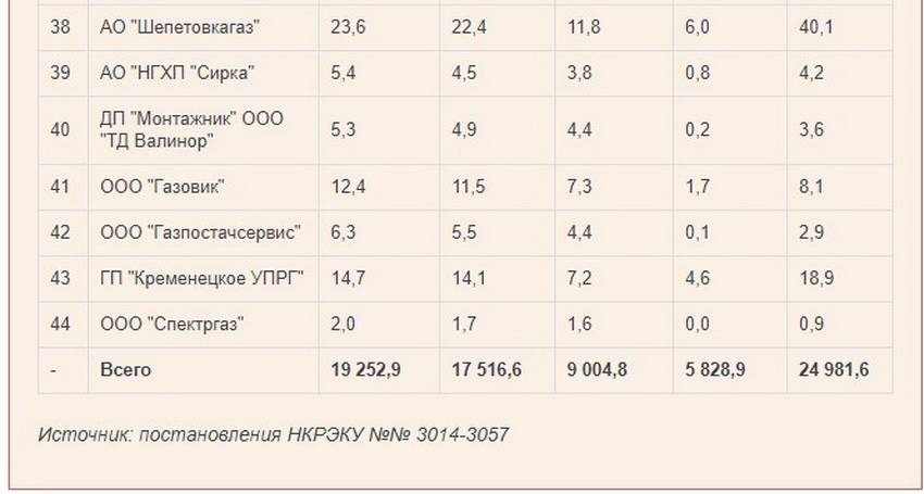 БизнесЦензор собрал в таблицу показатели из 44 постановлений НКРЭКУ, устанавливающих тарифы для облгазов. Все они состоят из двух таблиц – расчета на основе тарифа с 1 января и расчета на основе увеличенного тарифа с 1 июля.