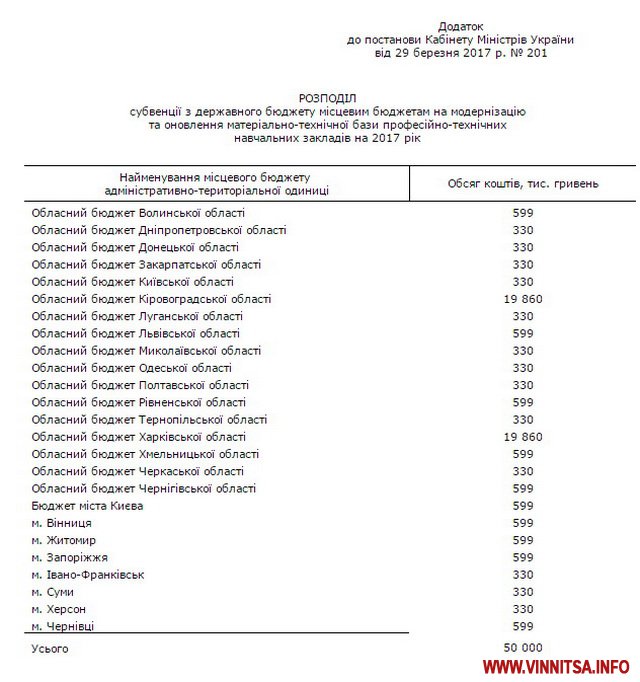 Уряд розподілив 50 млн. гривень субвенції з державного бюджету місцевим бюджетам на модернізацію та оновлення матеріально-технічної бази професійно-технічних навчальних закладів. Бюджет м. Вінниці отримає субвенцію в розмірі 599 тис. гривень.