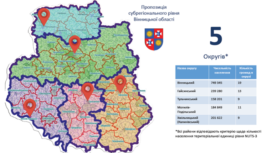 В березні 2020 року Центр політико-правових реформ презентував в Мінрегіоні пропозиції щодо кількості нових адмінтеродиниць субрегіонального рівня. У Вінницькій області пропонували замість 27 районів створити 5 повітів (районів): Вінницький, Жмеринський, Ладижинський, Могилів-Подільський, Немирівський та 68 ОТГ.