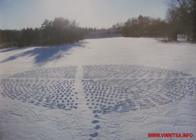 «Четыре квартала» («FOUR QUARTERS») Роя Стааба из США. Американский художник известен своими сложными инсталляциями, в которых использует различнейшие материалы. Но этот прекрасный объект он сделал просто - вытоптал в снегу. Когда же Рой узнал, что в 2006 году на первом «Мифогенезе» винничане использовали эту же идею, его это очень позабавило.