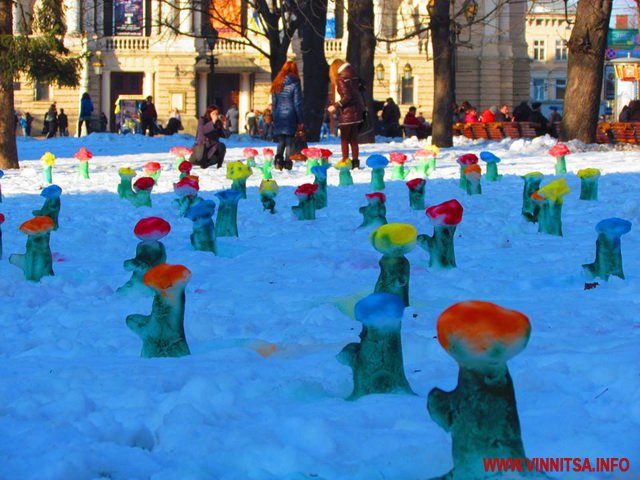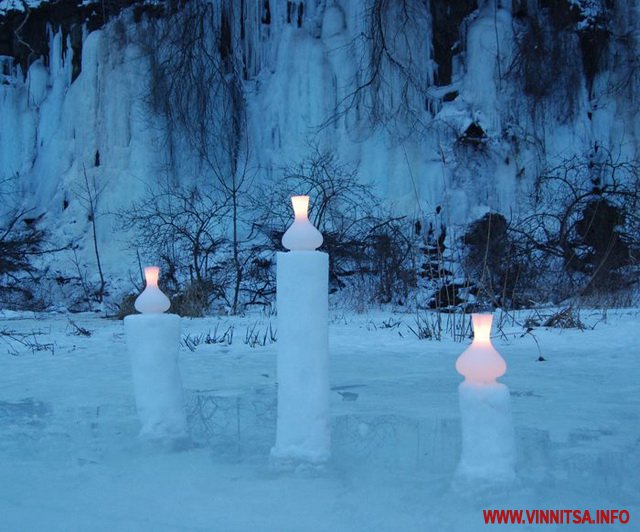 «Джерела свідомості. Епілог-1» Александра Никитюка. Свои светящиеся ледяные объекты художник «поселил» в Виннице на территории сквера «Кумбари», расположенном возле школы № 3 и бывшей детской поликлиники.