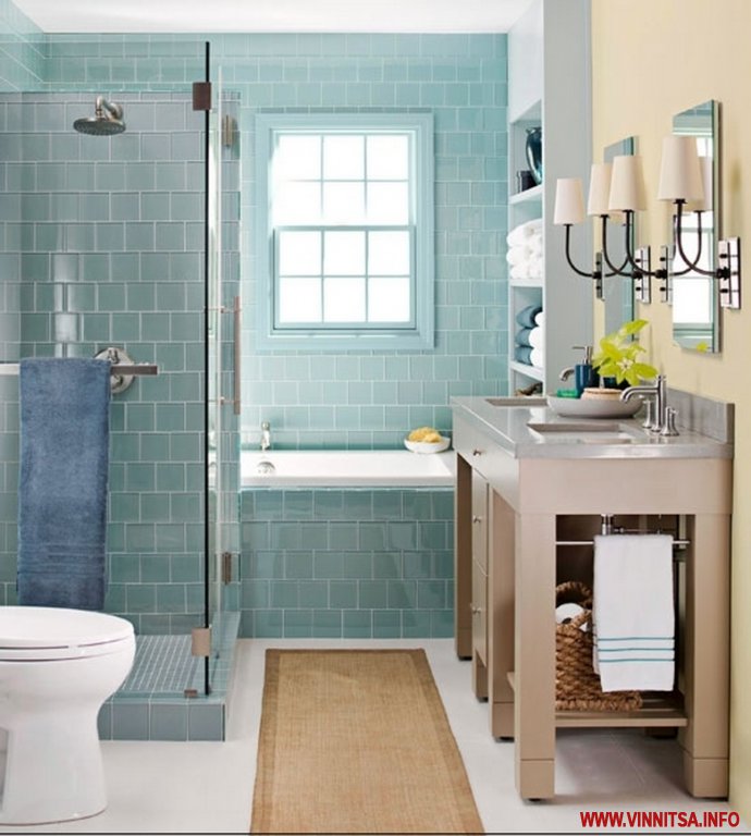 Также популярными стали кабинки внутри возведенного короба. Это удачное решение для маленьких санузлов. Возведение одной стены возле угла создает полноценную душевую кабину. Ее дополняют стеклянной дверью, которая бывает прозрачной, тонированной или цветной. Такая конструкция экономит массу места, ведь возле фальшстены можно установить унитаз, раковину или стиральную машину.